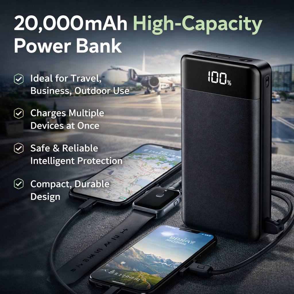 This 20000mAh high-capacity power bank provides multiple full charges on a single recharge, making it ideal for travel, business, and outdoor use. It supports simultaneous charging for multiple devices with stable, efficient output. Equipped with an intelligent protection chip, it automatically adjusts current to ensure safe and reliable charging. Durable yet compact, it is a dependable power solution for everyday life and on-the-go scenarios.